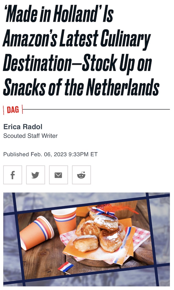 Dus - moet ik bekennen - houd ik toch altijd wel met een schuin oog de typisch Nederlandse etenswaren (en dranken) in de gaten. Blij verrast waren we daarom toen we lazen dat internetgigant Amazon een speciale pagina heeft gemaakt waarop al die Hollandse lekkernijen zijn samengebracht (en dus met één druk op de knop vanuit Amerika te bestellen zijn). Tenminste dat dachten we. De schrijver van het artikel had namelijk verzuimd een link naar de betreffende pagina te vermelden. En het online warenhuis is zo belachelijk groot (je kunt er sinds kort zelfs een voordelige zorgverzekering afsluiten) dat zo’n pagina met lekkers uit ons vaderland niet zomaar één-twee-drie op het scherm verschijnt.