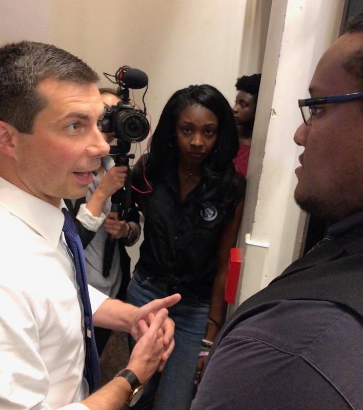 Maar uit dezelfde peilingen blijkt dat zijn populariteit onder zwarte Amerikanen nagenoeg nul is. Dat komt deels door het feit dat zijn campagne-boodschap niet veel anders is dan die van de andere Democraten, maar ook door kritiek van veel zwarten op het politie-toezicht in South Bend. Niet toevallig dus dat de avond wordt gehouden in Bronzeville.