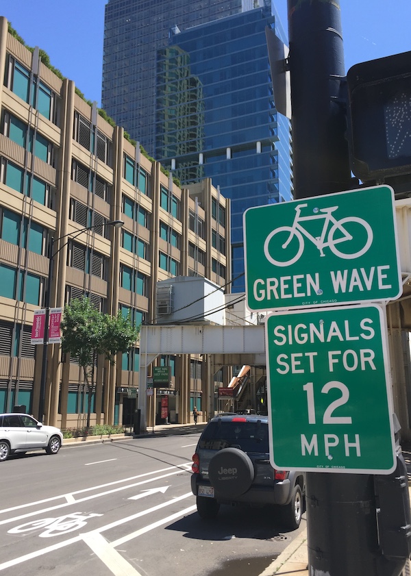 Maar het mooiste voorbeeld van on-Amerikaanse fietsverbetering is de groene golf op North Wells Street in het centrum. Wie daar 12mph (19 km/u) fietst ziet bij elke kruising het licht op groen springen, iets wat ik in Nederland nog niet ben tegengekomen. Nu nog gebruikt 1,7 procent van de inwoners van Chicago de fiets voor het woon-werkverkeer. Nog een paar fietspaden en groene golven en we zitten op de 24 procent die Nederland haalt!